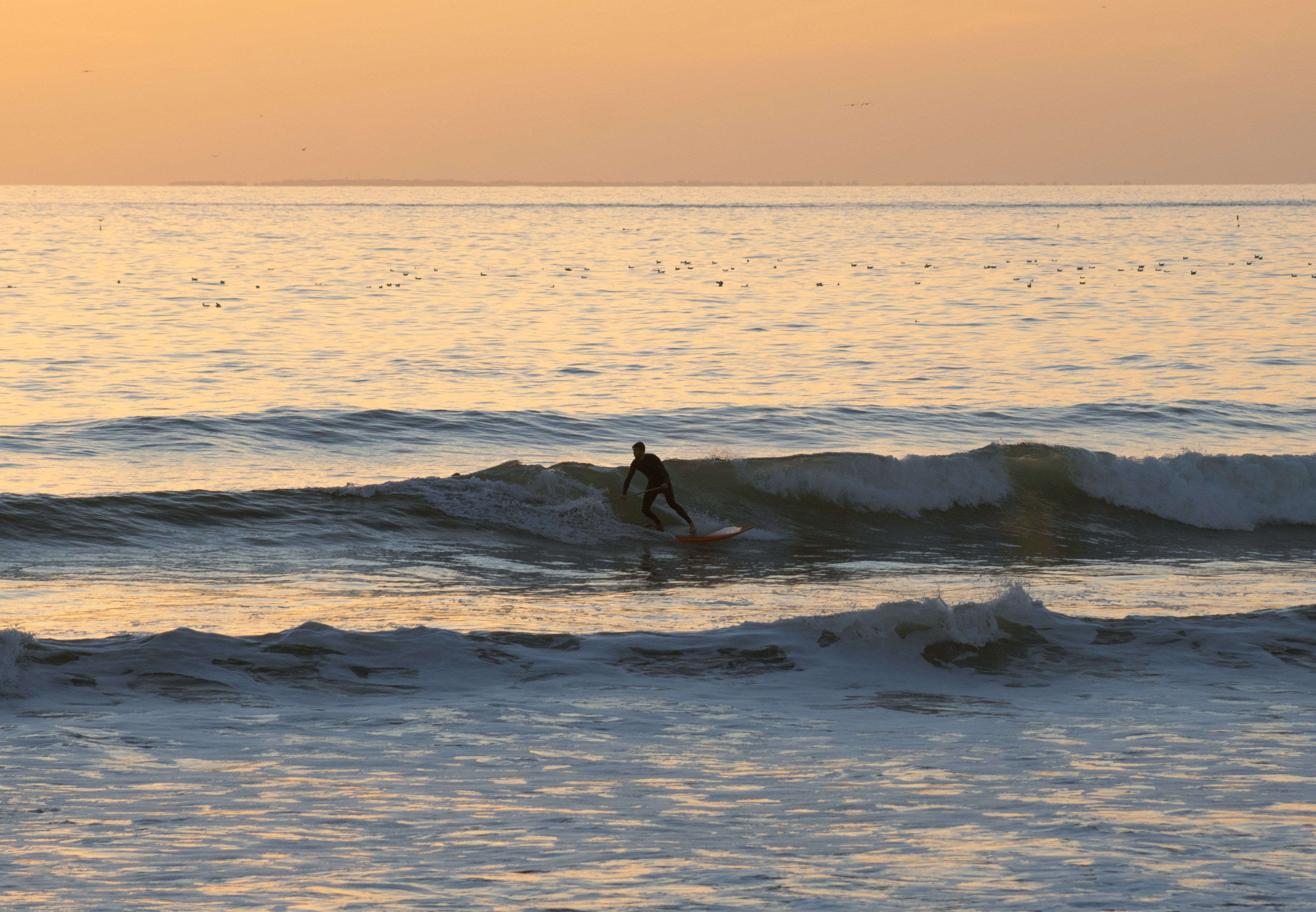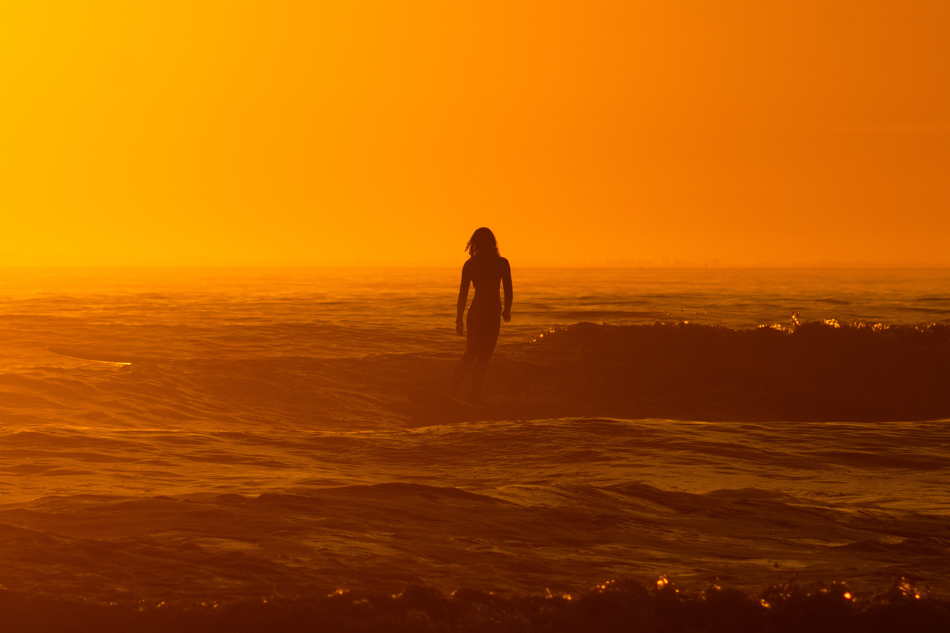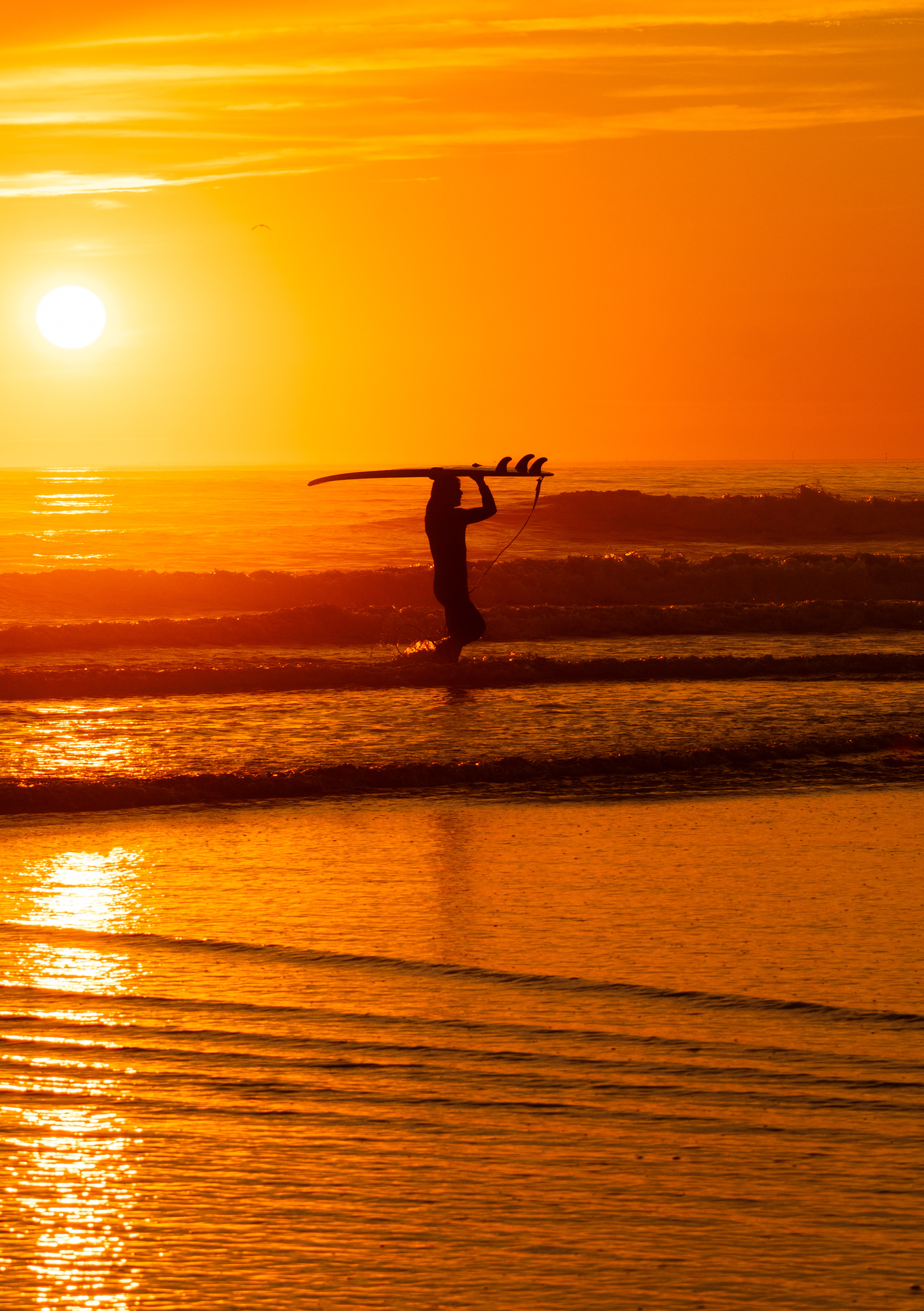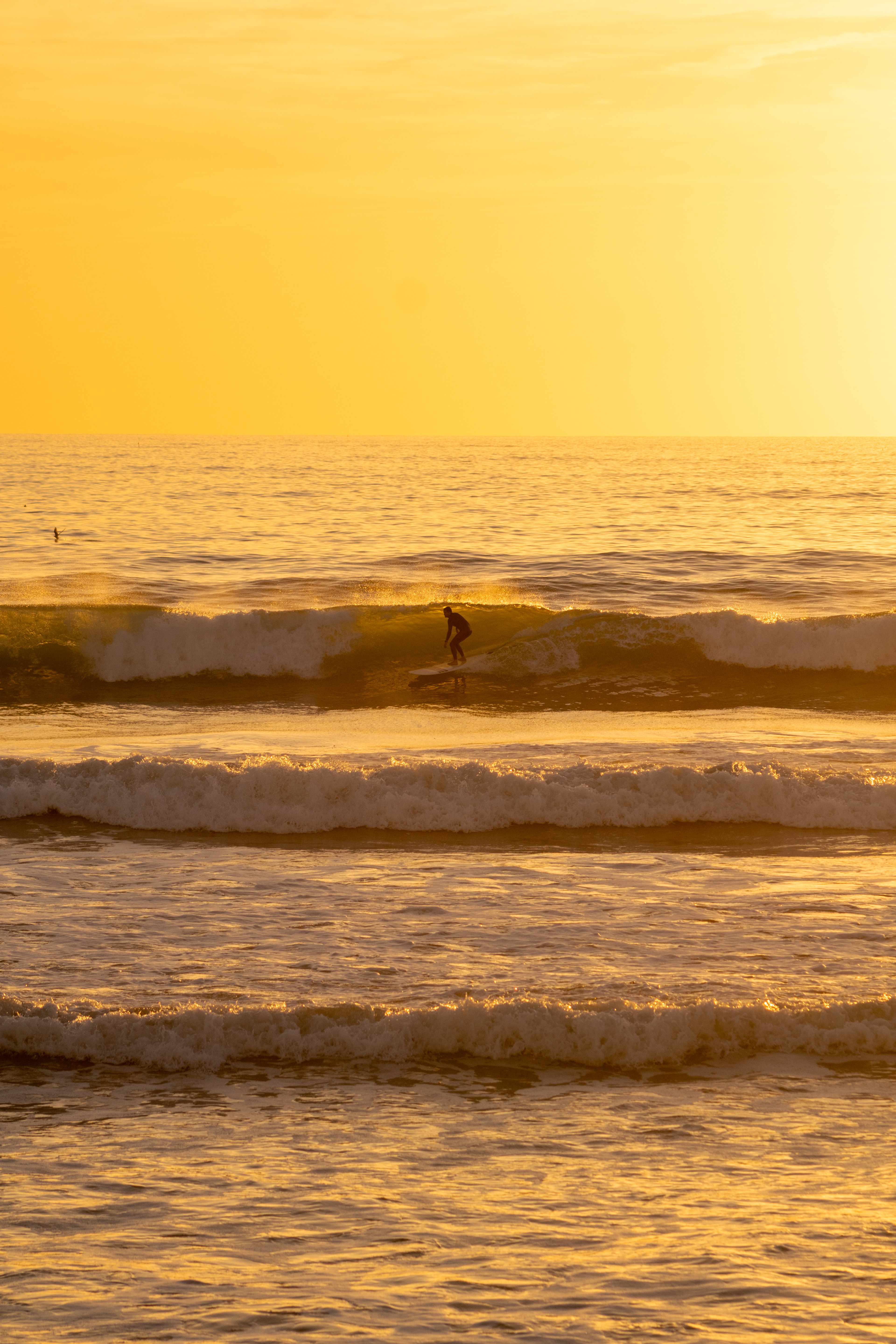 La lumière tombe, les vagues se teintent d’or. Entre silence et mouvement, le surf devient lumière.