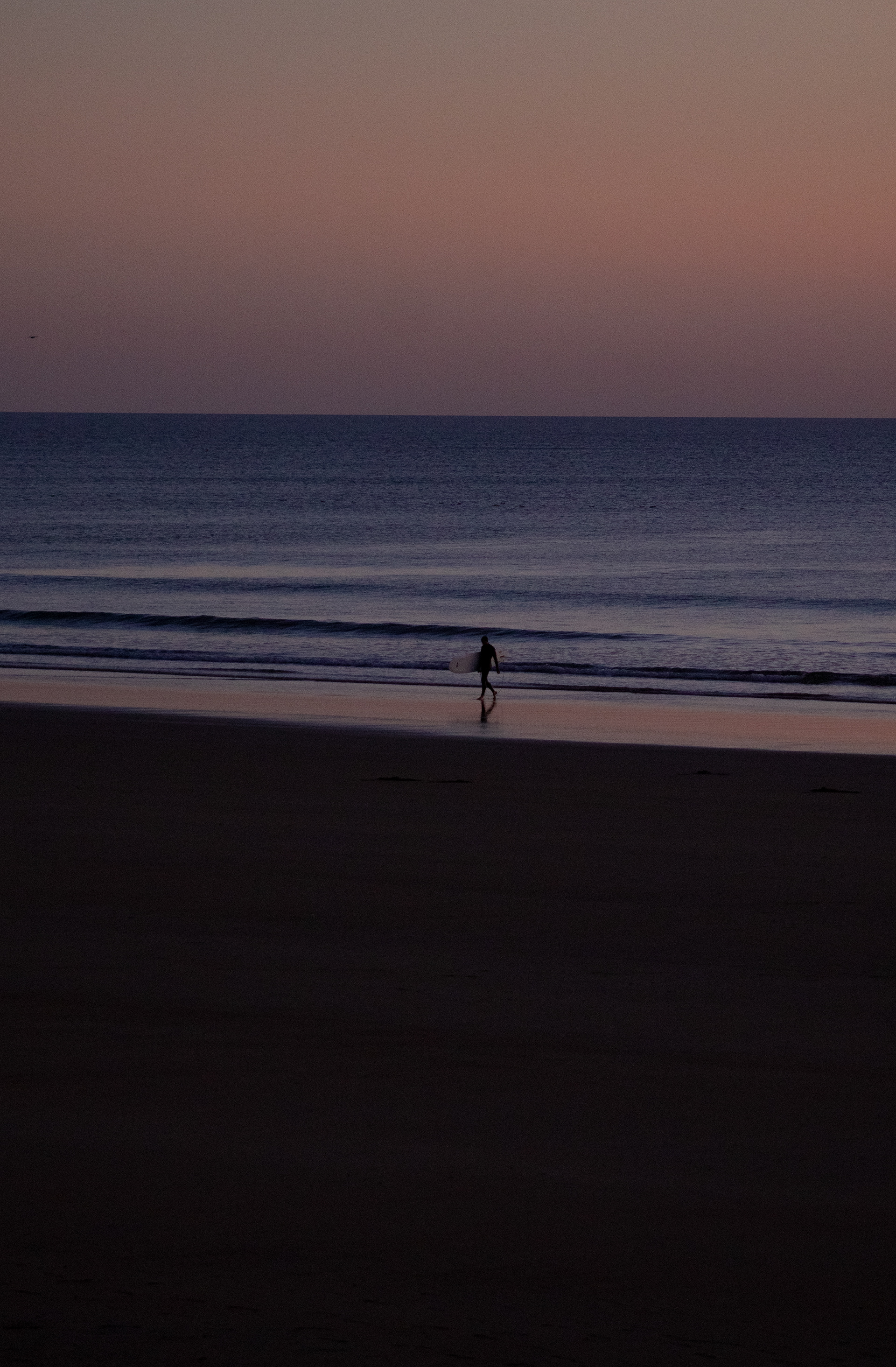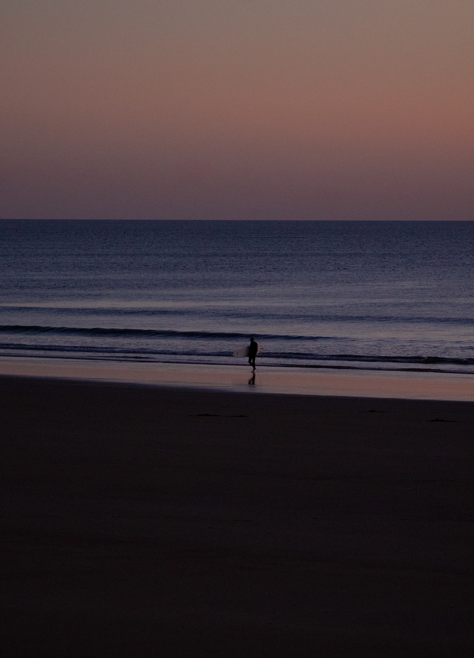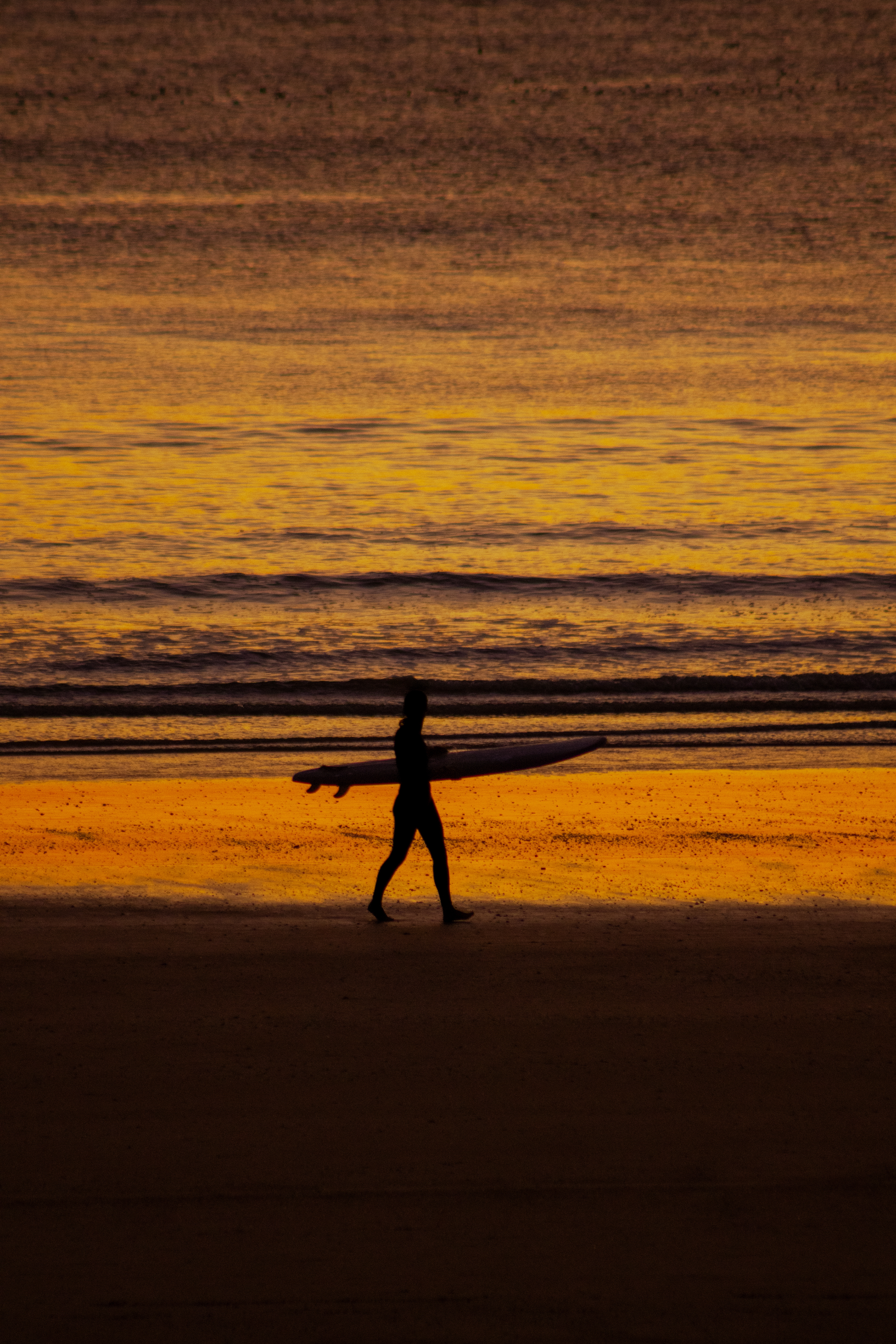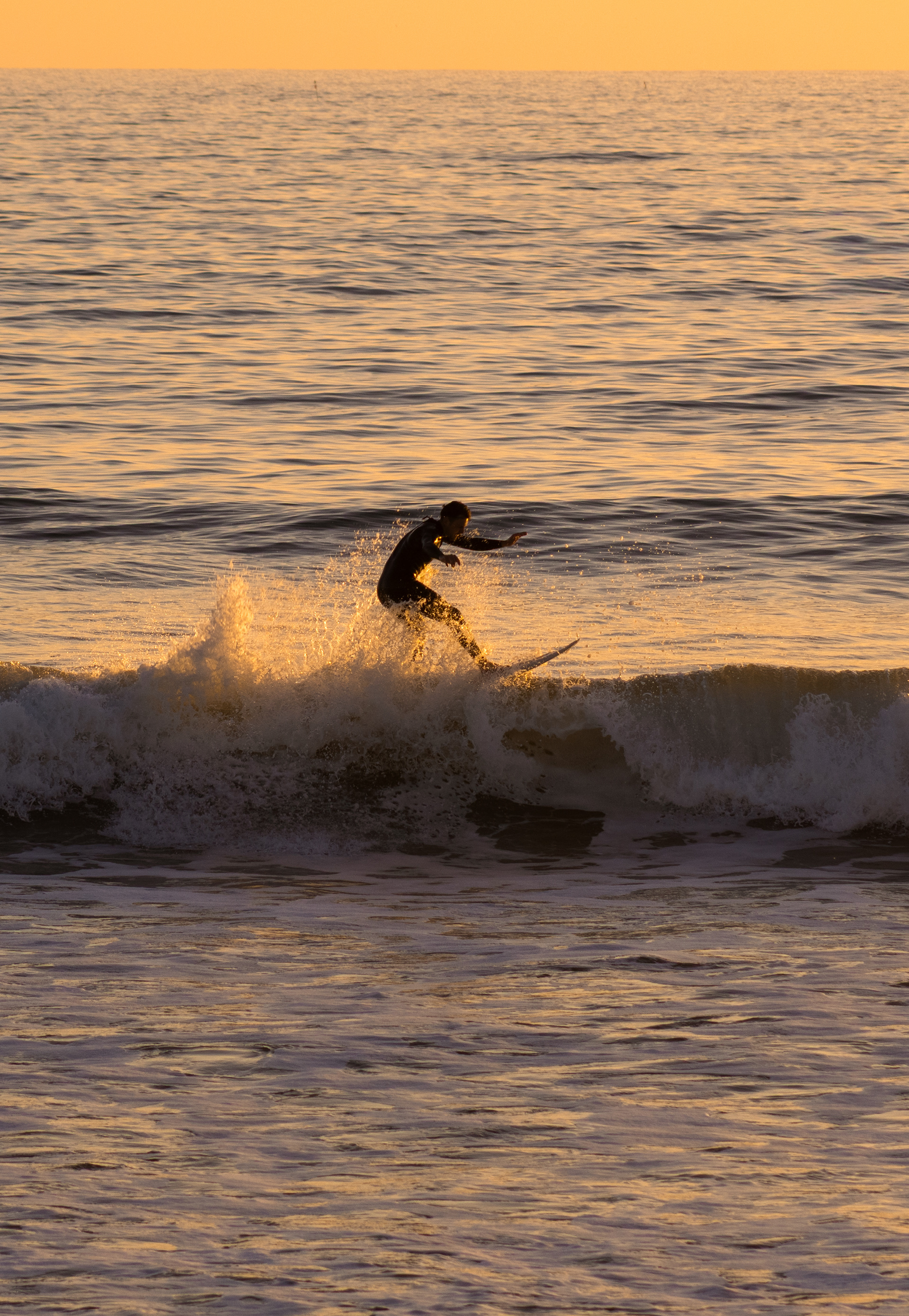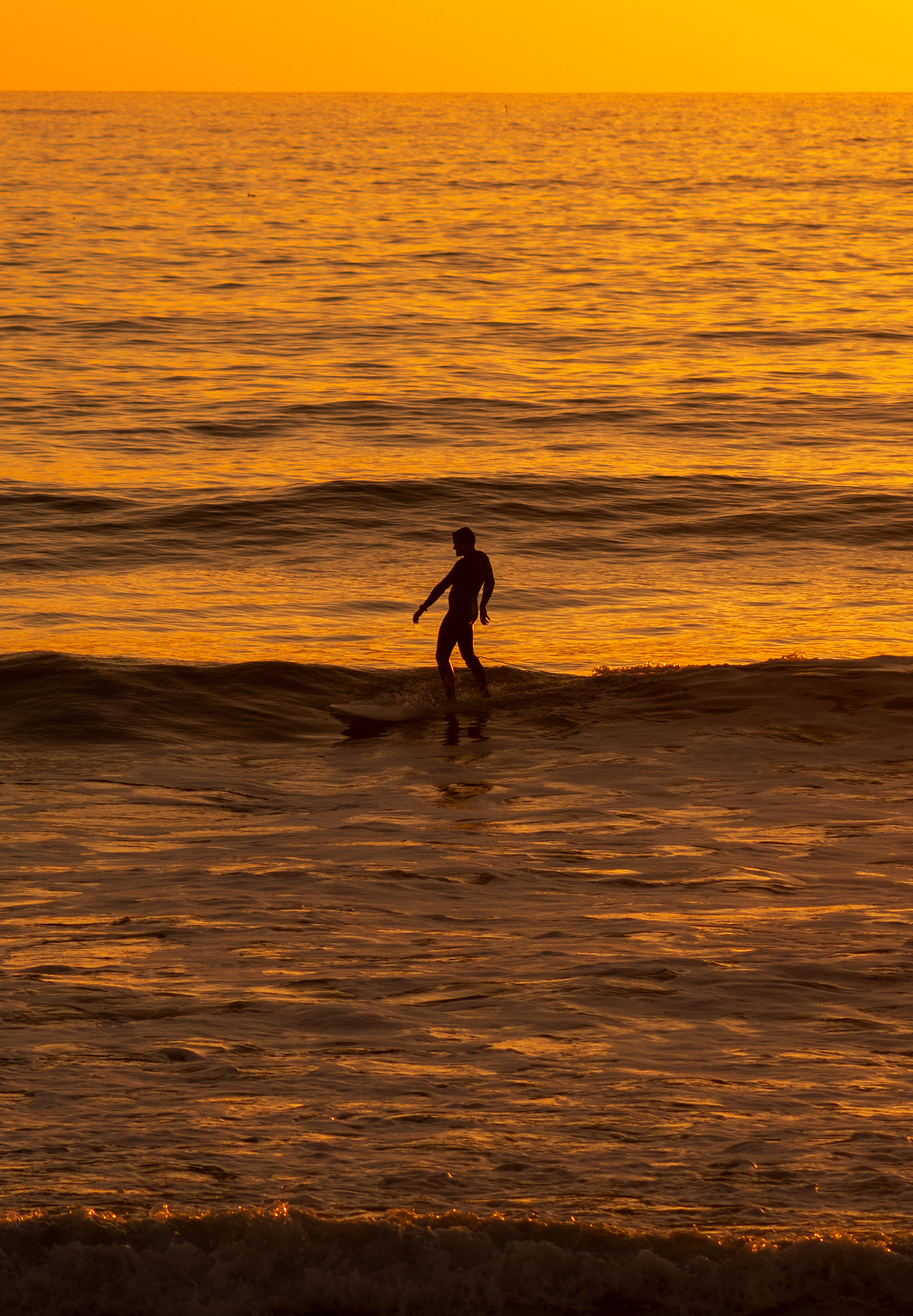 La lumière tombe, les vagues se teintent d’or. Entre silence et mouvement, le surf devient lumière.